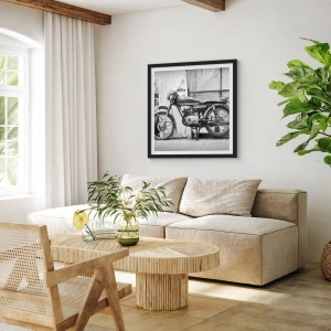 • El póster "Motocicleta Retro" muestra una motocicleta clásica vintage sobre una pared de madera. La paleta de colores monocromática realza su carácter crudo y nostálgico. Incluye un marco negro.