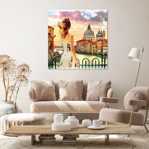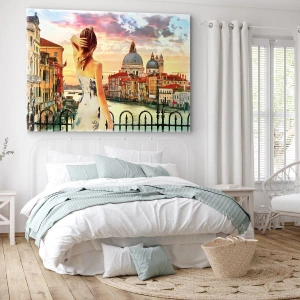 - Esta pintura representa a una mujer admirando el pintoresco paisaje urbano junto al canal bajo la luz del atardecer. Perfecta para interiores elegantes y románticos.