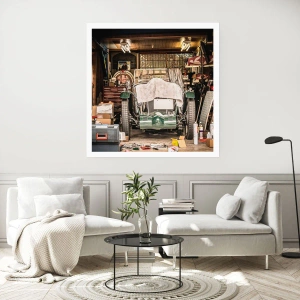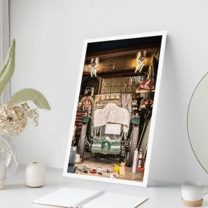 Póster - Un coche viejo en un garaje rodeado de herramientas y equipos. - 100x70cm - Volver al pasado - Decoración de pared moderna para salón y dormitorio ARTTOR