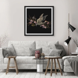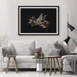 Póster en marco negro - Un pájaro en vuelo con flores sobre un fondo negro. - 70x50cm - Ave florida - Decoración de pared moderna para salón y dormitorio ARTTOR
