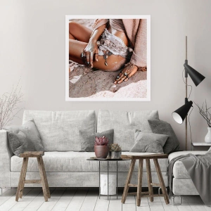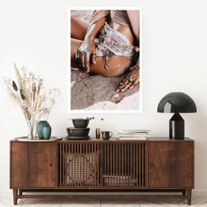 Póster - Mujer de estilo boho en una playa de arena con decoraciones de conchas marinas. - 50x70cm - Bañada por el sol y la arena - Decoración de pared moderna para salón y dormitorio ARTTOR