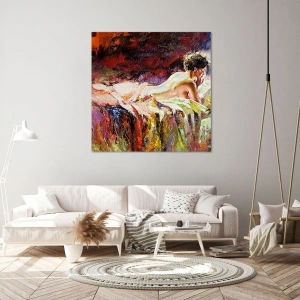 La figura central de la pintura es una mujer, cuya delicada silueta contrasta con la riqueza e intensidad de los colores circundantes. El artista utilizó la pintura al óleo para enfatizar la textura y la profundidad de la composición, lo que le otorga un carácter único y una expresión artística excepcional. Las expresivas pinceladas en tonos cálidos de rojo, naranja y amarillo armonizan a la perfección con sutiles toques de colores pastel.