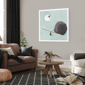 Póster - Una balanza minimalista con una piedra y una figura con la luna como fondo. - 50x70cm - Un sueño hecho realidad - Decoración de pared moderna para salón y dormitorio ARTTOR