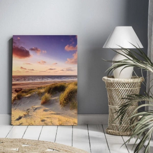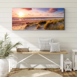 Cuadro sobre lienzo - Impresión de Imagen - Una playa cubierta de hierba y una puesta de sol sobre un mar en calma. - 160x50cm - Se siente la brisa veraniega - Decoración de pared moderna para salón y dormitorio ARTTOR