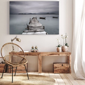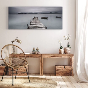 - El cuadro "Puedes irte mañana" representa un embarcadero de madera que conduce a un lago tranquilo en un entorno gris y evocador. Una composición sutil y armoniosa, perfecta para interiores llenos de tranquilidad y reflexión.