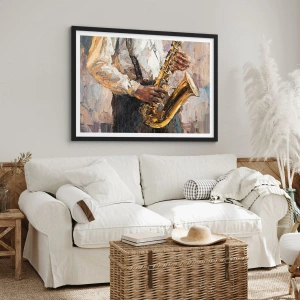 Póster en marco negro - Un saxofonista tocando en un estilo de pintura artística. - 50x70cm - Llegó el momento del solo - Decoración de pared moderna para salón y dormitorio ARTTOR