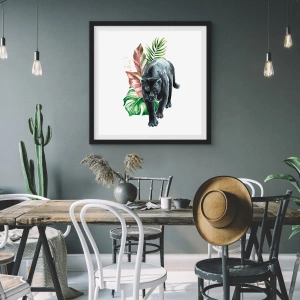 - Este póster, que presenta una pantera negra sobre un fondo de follaje tropical, captura una atmósfera salvaje y exótica. Esta composición artística complementa a la perfección los interiores modernos.