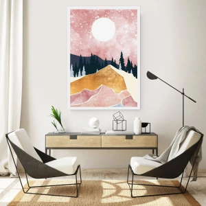 Póster - Paisaje abstracto con bosque, montañas y acentos dorados. - 50x70cm - Vigilancia nocturna - Decoración de pared moderna para salón y dormitorio ARTTOR
