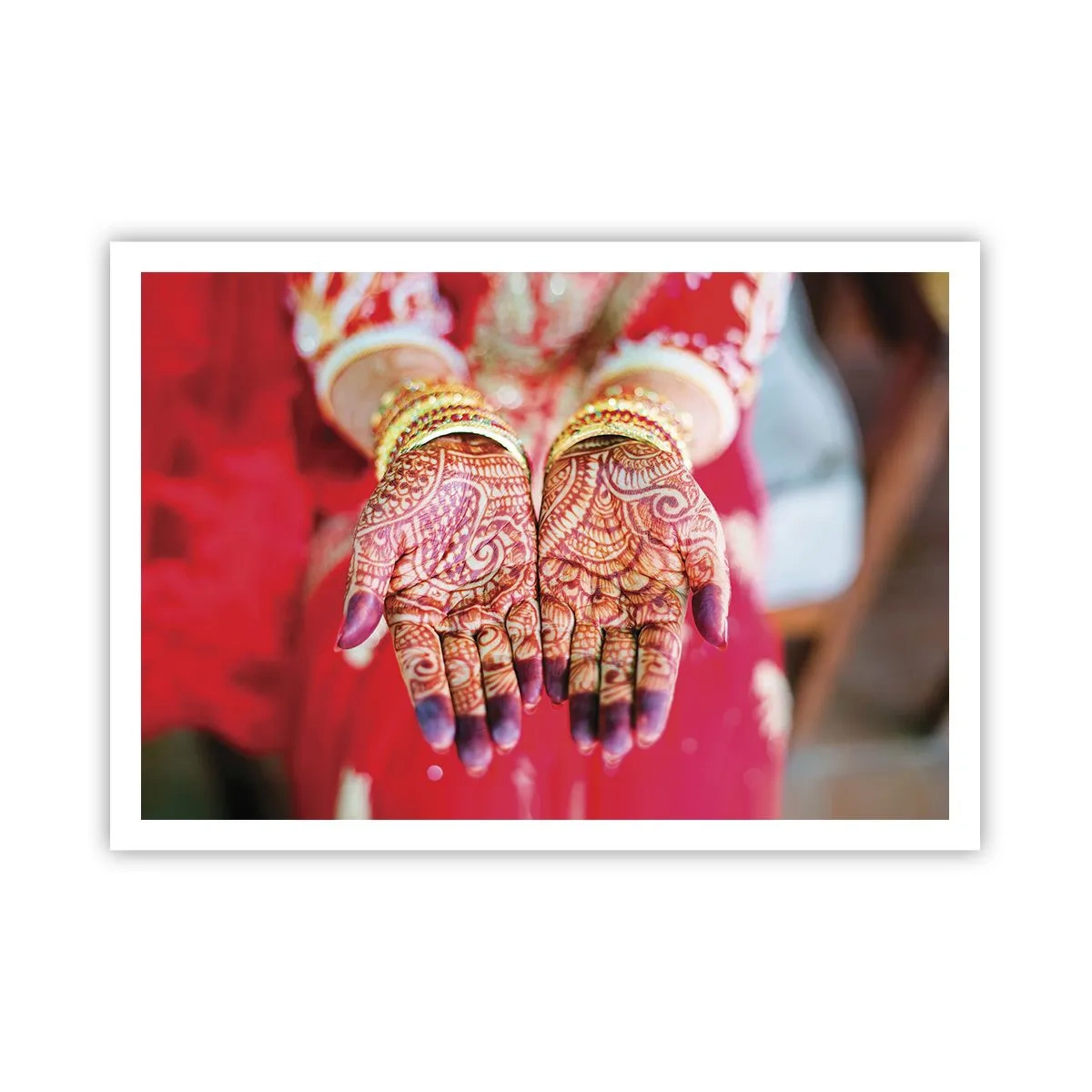 Póster - Manos decoradas con henna sobre el fondo de un vestido rojo. - 100x70cm - Ritual con las manos - Decoración de pared moderna para salón y dormitorio ARTTOR
