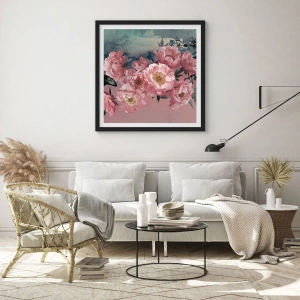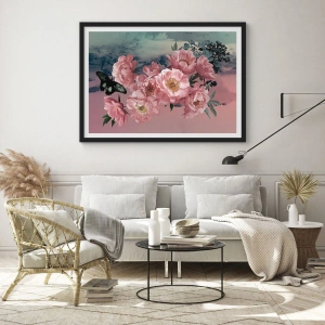 Póster en marco negro - Peonías rosas con una mariposa sobre un fondo pastel. - 70x50cm - La cúspide del romance - Decoración de pared moderna para salón y dormitorio ARTTOR