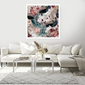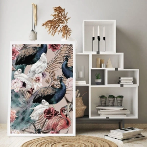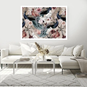 Póster - Pájaros y flores de colores sobre un fondo beige - 50x70cm - En un jardín de palacio - Decoración de pared moderna para salón y dormitorio ARTTOR