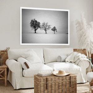 Póster - Tres árboles en un campo nevado en estilo monocromático. - 100x70cm - ¿Con qué sueñan? - Decoración de pared moderna para salón y dormitorio ARTTOR