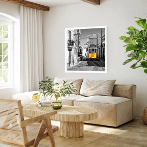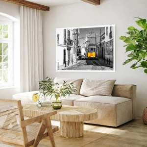 Póster - Un tranvía amarillo en las calles de Lisboa en un entorno monocromático. - 100x70cm - Espíritu de Lisboa - Decoración de pared moderna para salón y dormitorio ARTTOR