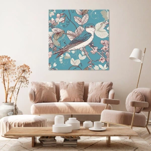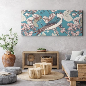 Cuadro sobre lienzo - Impresión de Imagen - Un pájaro en una rama en un delicado estilo floral. - 160x50cm - En el cerezo - Decoración de pared moderna para salón y dormitorio ARTTOR
