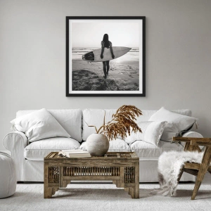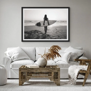 - Este póster muestra a una mujer con una tabla de surf en una playa al atardecer. Este diseño en blanco y negro es perfecto para interiores elegantes y modernos. El set incluye un marco negro de 50 x 70 cm.