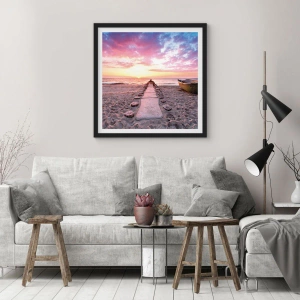 Póster en marco negro - Playa al amanecer con barco y muelle - 70x50cm - Un momento de profunda experiencia - Decoración de pared moderna para salón y dormitorio ARTTOR