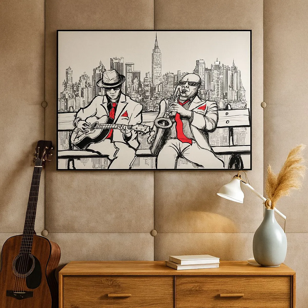 Cuadro sobre lienzo - Impresión de Imagen - Un dúo de jazz con saxofón y guitarra con la ciudad como telón de fondo. - 100x70cm - Improvisación en Nueva York - Decoración de pared moderna para salón y dormitorio ARTTOR