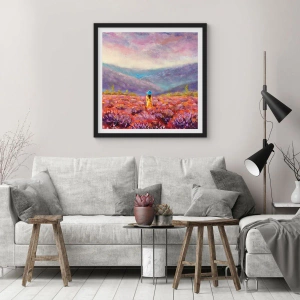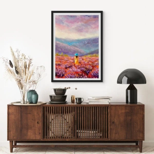 Póster en marco negro - Una mujer con sombrero caminando por un campo de lavanda. - 70x50cm - En un mundo de lavanda - Decoración de pared moderna para salón y dormitorio ARTTOR
