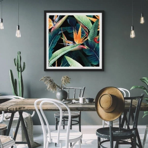 - Este póster representa la exótica flor de strelitzia sobre un fondo oscuro, perfecto para interiores caracterizados por la elegancia y la armonía. El formato es de 50 x 70 cm e incluye un marco negro.