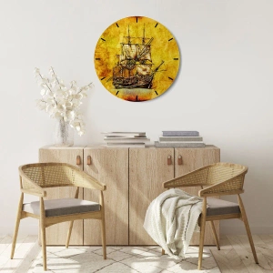 - El diseño gráfico de un velero sobre un fondo dorado crea una composición decorativa clásica y elegante. Este reloj redondo es perfecto para interiores de estilo vintage o náutico.