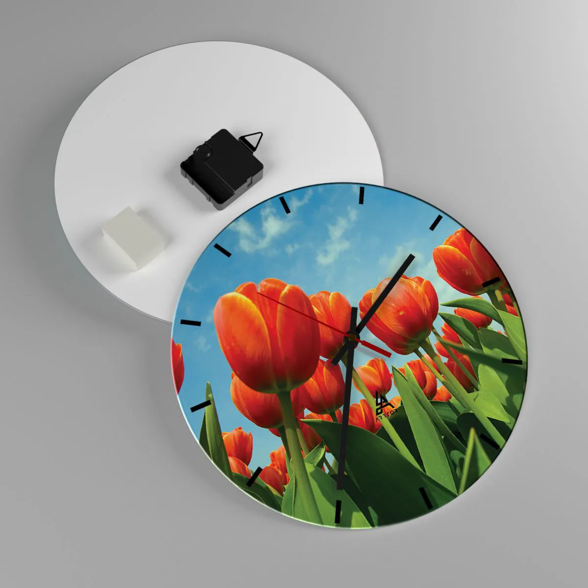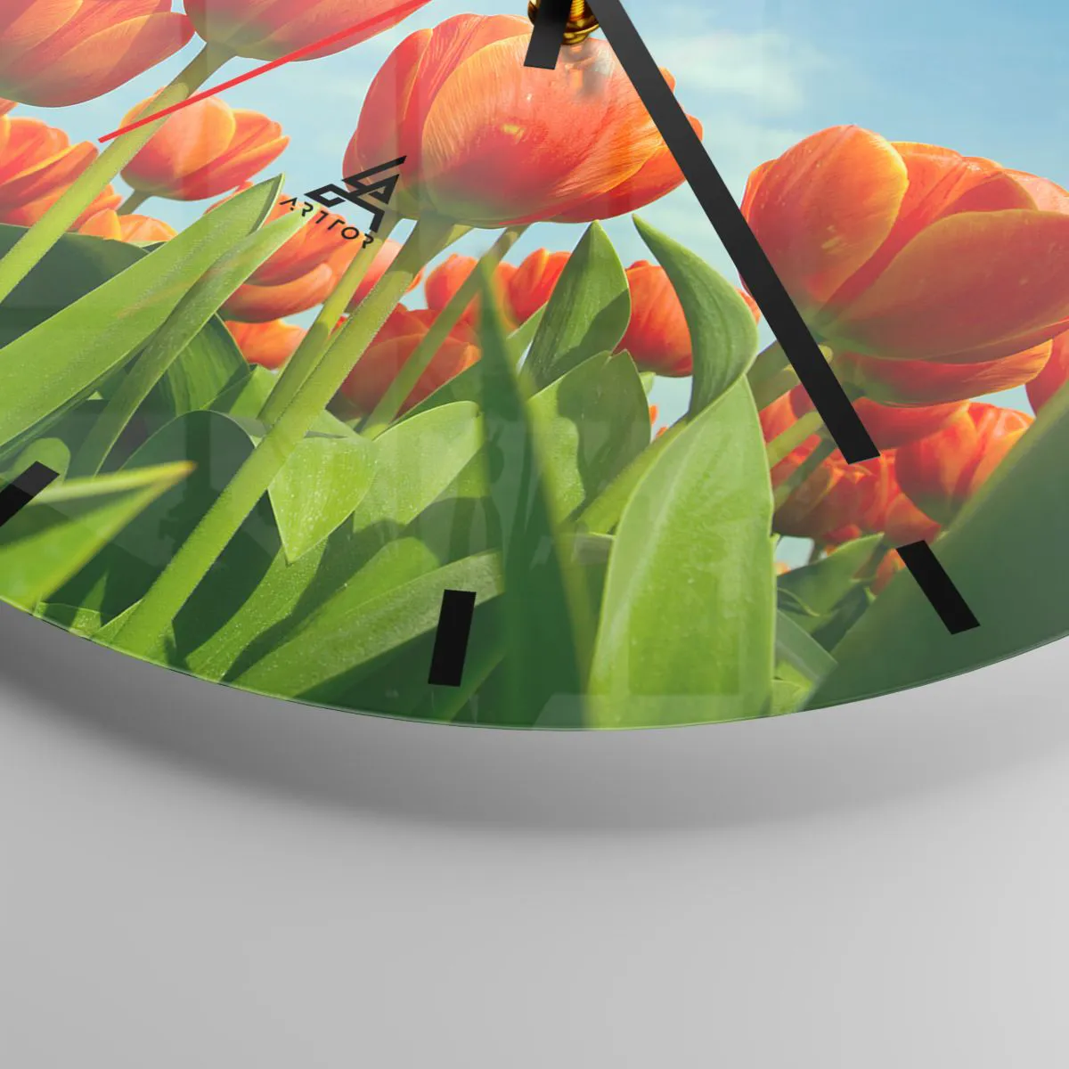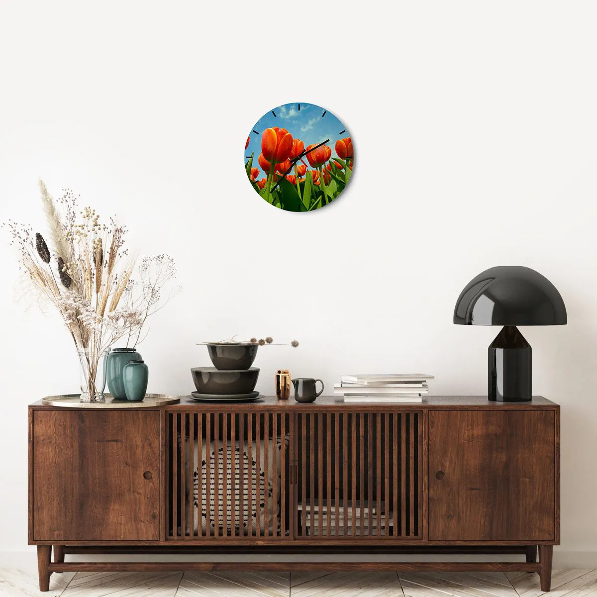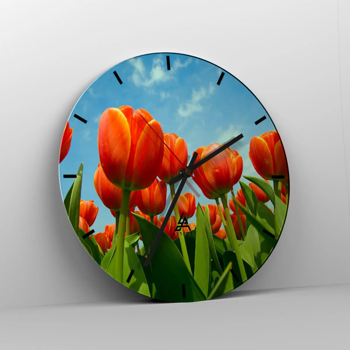 - Tulipanes rojos contra un cielo azul crean una decoración fresca y primaveral. Este reloj redondo es perfecto para interiores inspirados en la naturaleza.