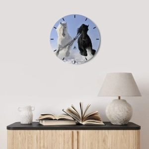 Reloj de pared - Reloj de vidrio - Un caballo blanco y uno negro galopando por la nieve. - 30x30cm - Galope blanco y negro - Decoración de pared moderna para salón y dormitorio ARTTOR