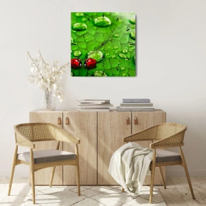 - Una macrofotografía de mariquitas sobre una hoja cubierta de gotas de agua. Un motivo natural que aporta frescura y armonía a cualquier interior.