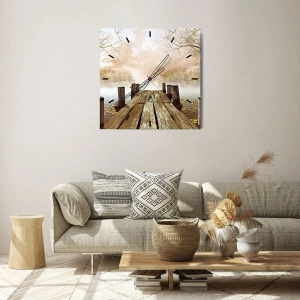 Reloj de pared - Reloj de vidrio - Un muelle de madera que conduce a un lago tranquilo en la niebla de la mañana. - 30x30cm - La leve tristeza del otoño - Decoración de pared moderna para salón y dormitorio ARTTOR