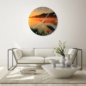 - Este reloj de pared representa un barco en un lago por la mañana, envuelto en niebla. Los cálidos tonos del sol naciente y la tranquilidad del paisaje crean un armonioso diseño interior.