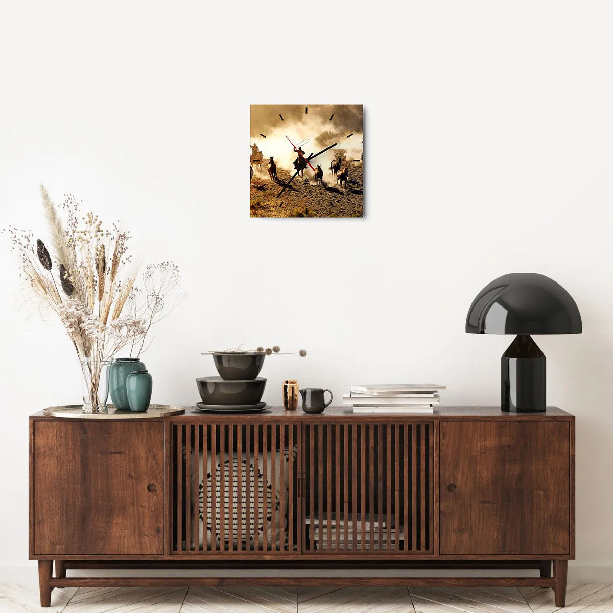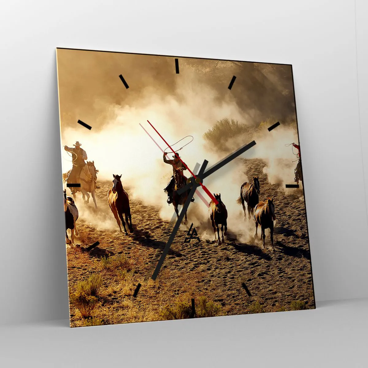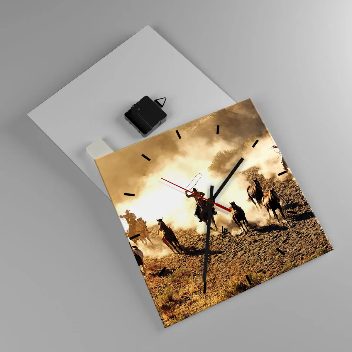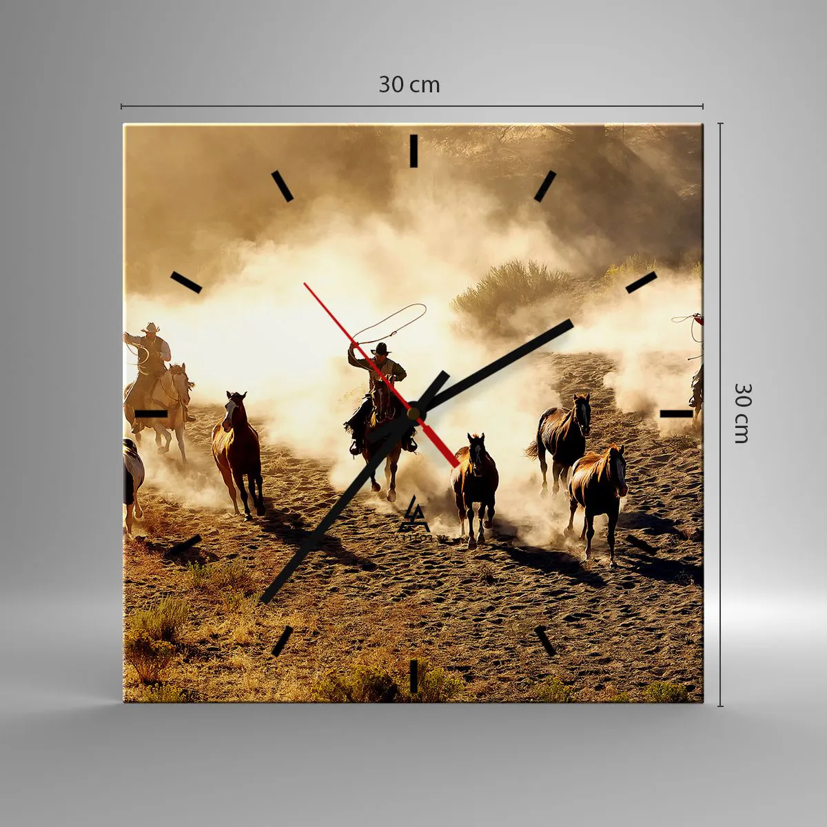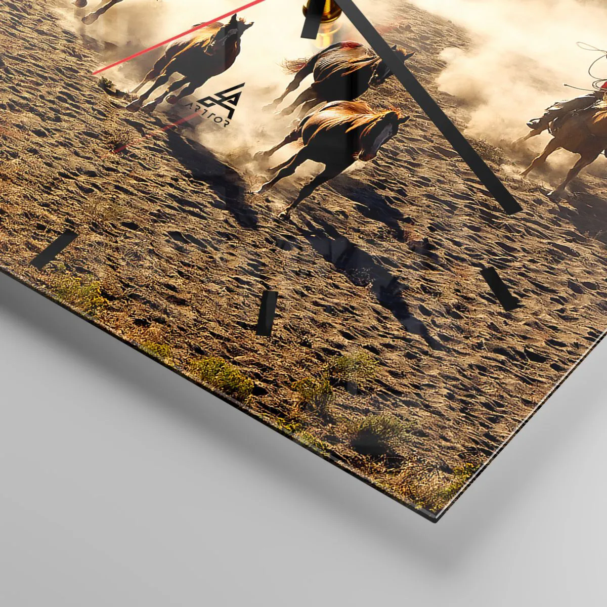 Reloj de pared - Reloj de vidrio - Vaqueros a caballo en acción en el terreno desértico. - 30x30cm - El salvaje oeste - Decoración de pared moderna para salón y dormitorio ARTTOR