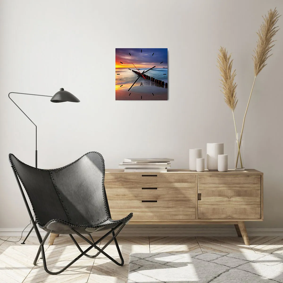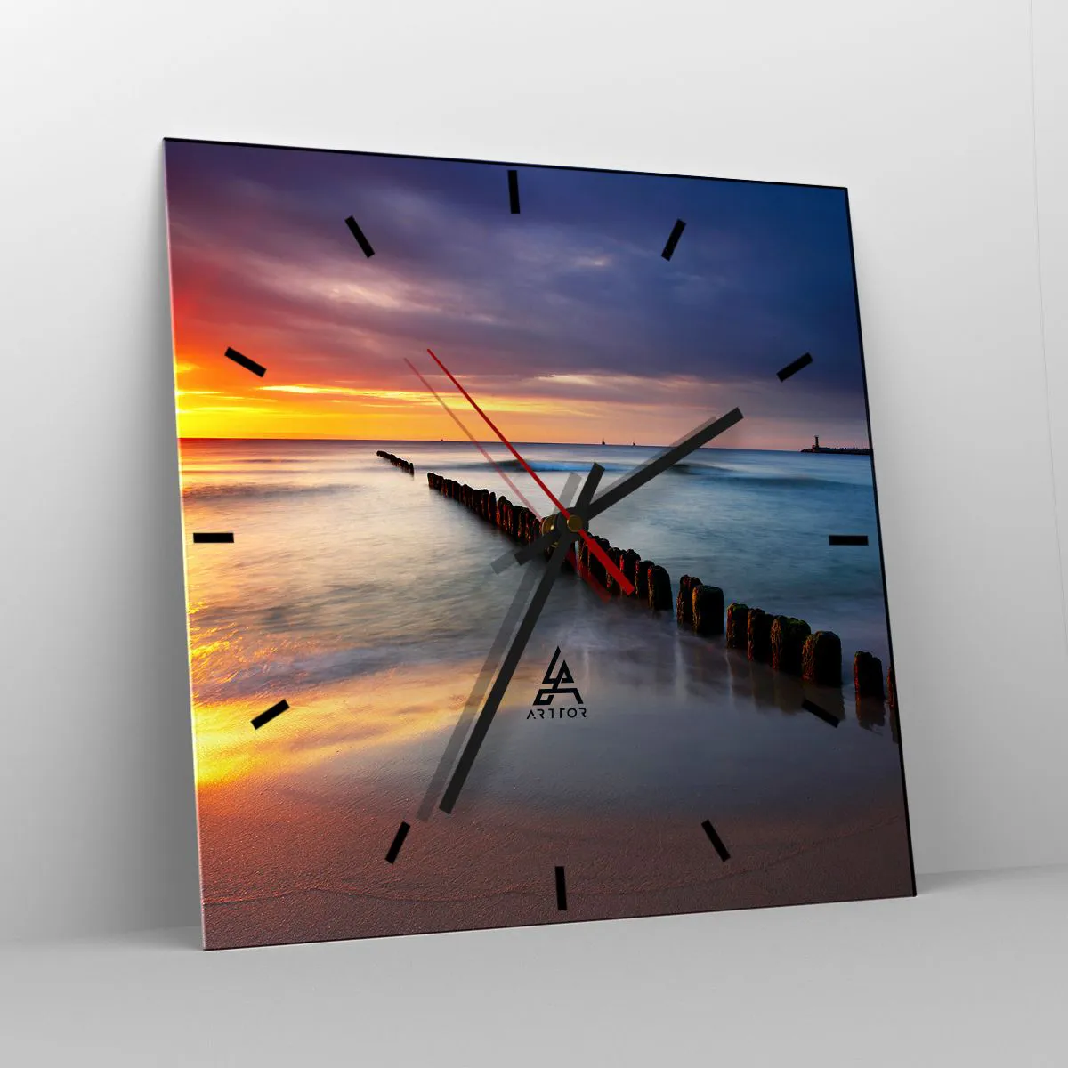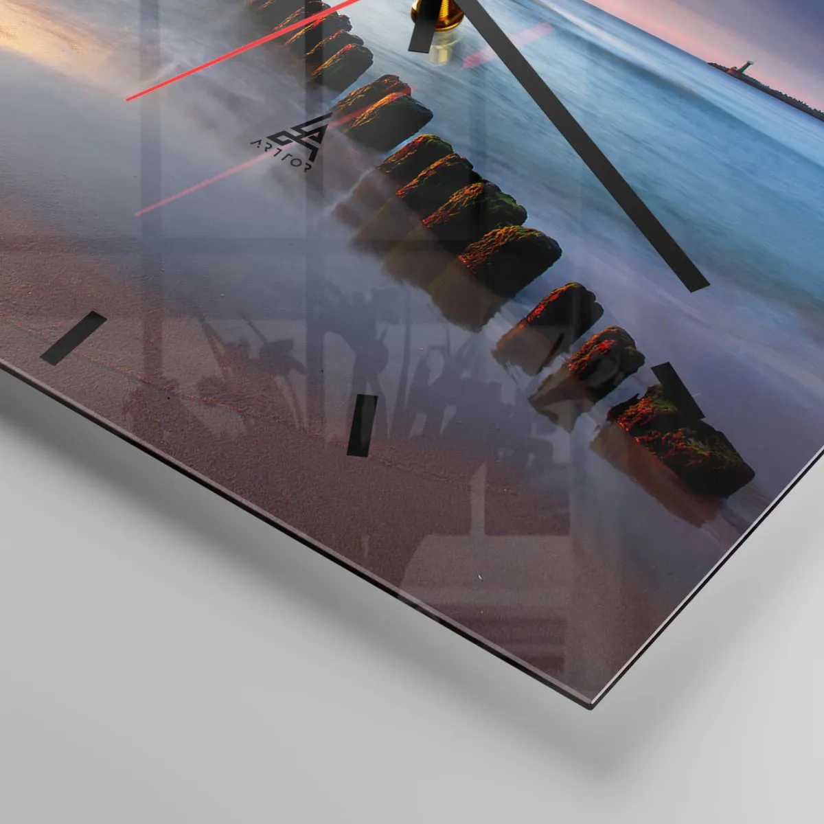 Reloj de pared - Reloj de vidrio - Puesta de sol sobre el mar con un rompeolas en primer plano - 30x30cm - Escuchar el silencio - Decoración de pared moderna para salón y dormitorio ARTTOR