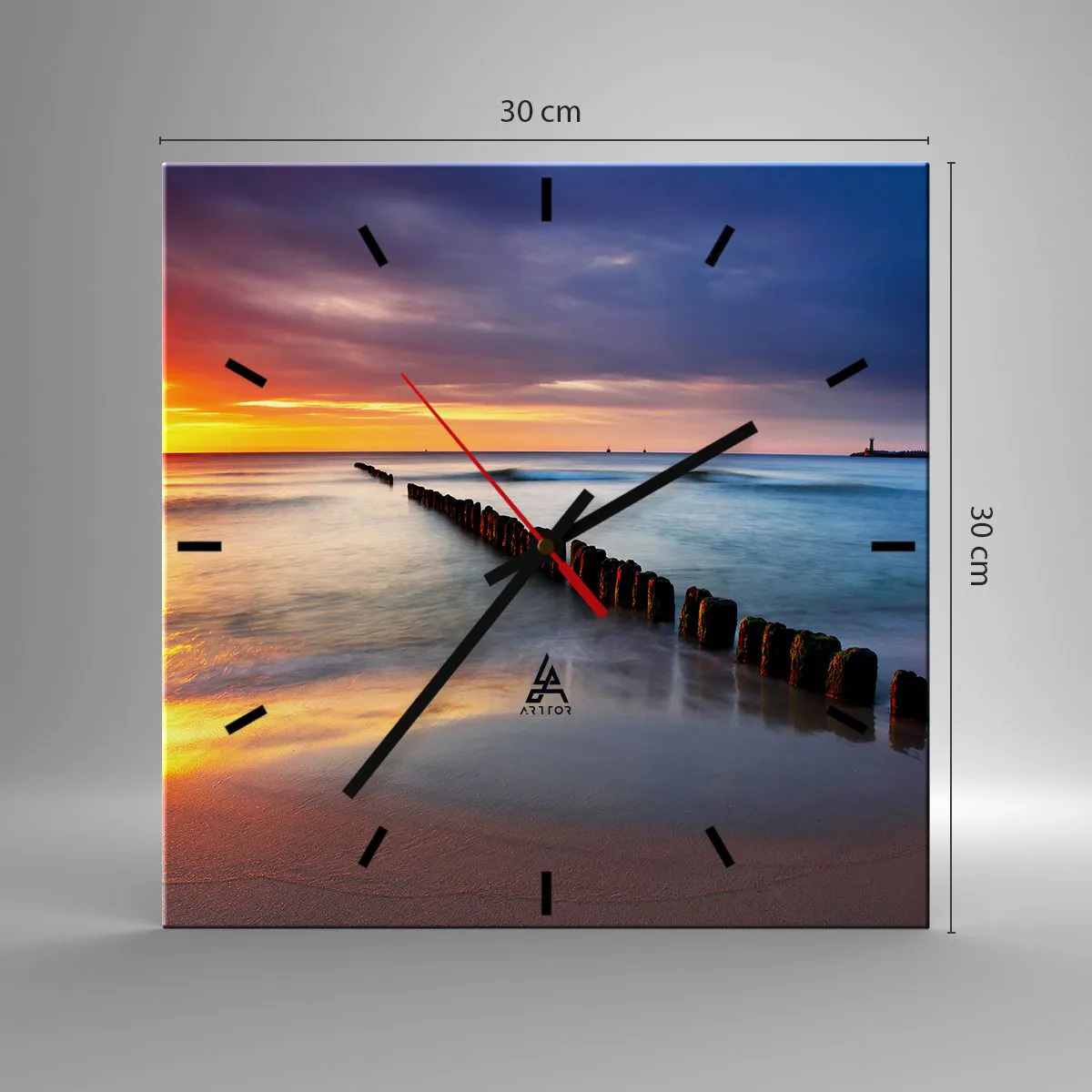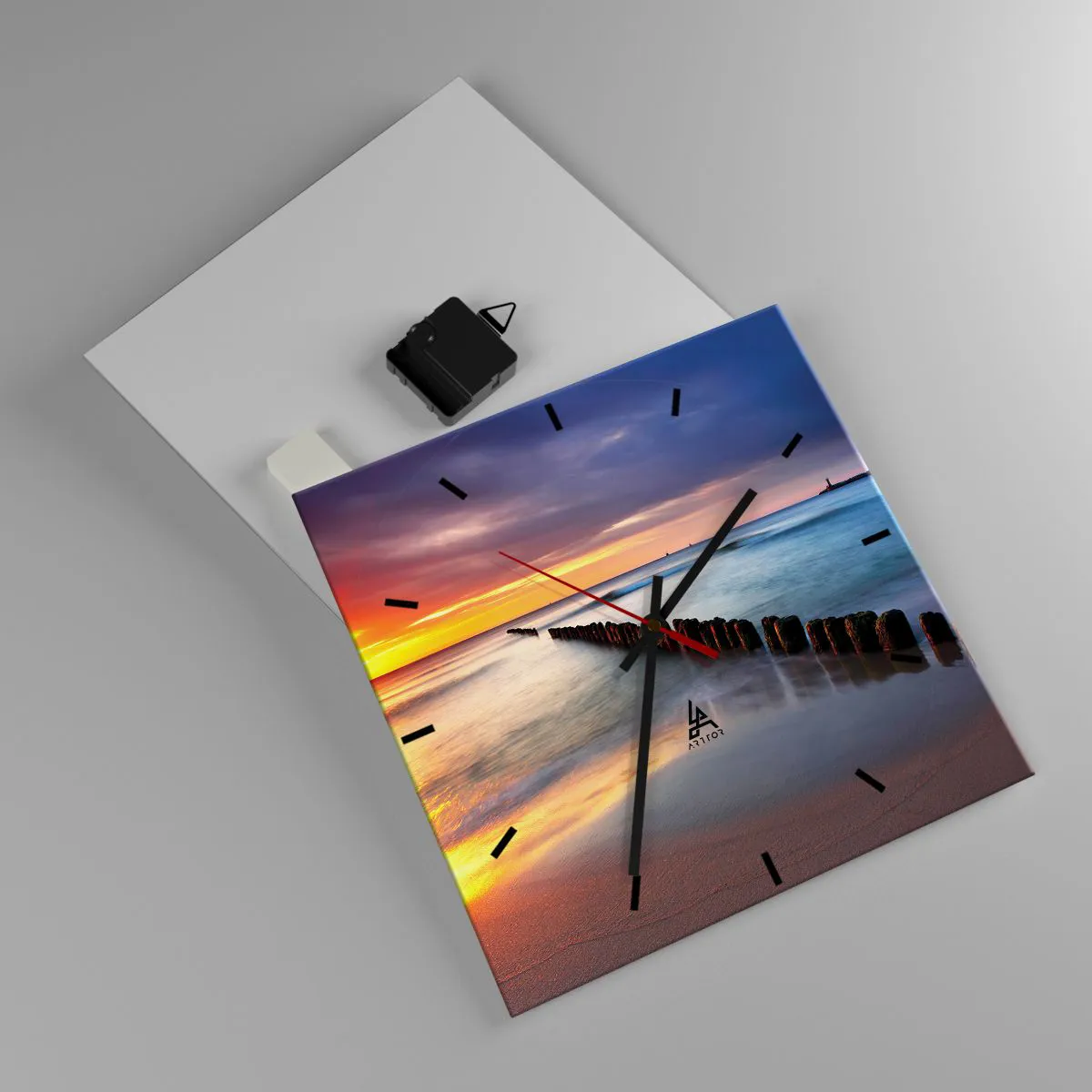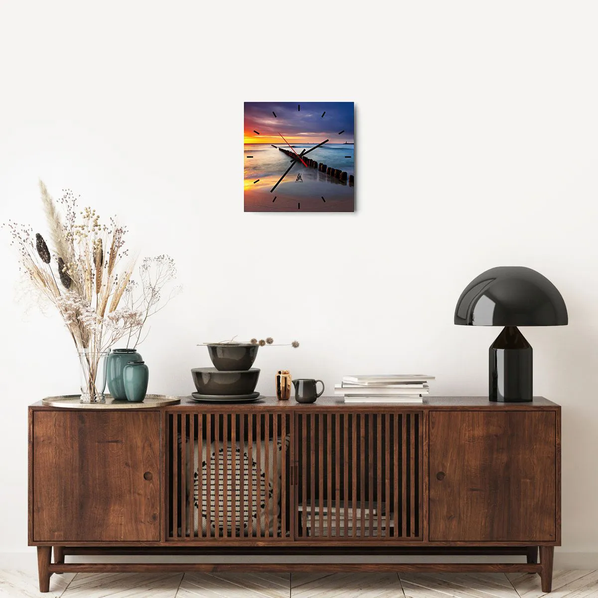 Reloj de pared - Reloj de vidrio - Puesta de sol sobre el mar con un rompeolas en primer plano - 30x30cm - Escuchar el silencio - Decoración de pared moderna para salón y dormitorio ARTTOR