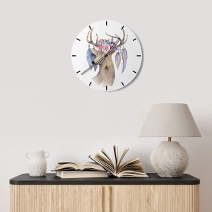 - Este reloj de pared presenta una ilustración artística de un ciervo con flores en sus astas y plumas. Una elegante decoración bohemia, perfecta para interiores modernos.