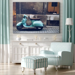 Atmósfera inolvidable es una impresión en lienzo que representa un scooter retro aparcado contra un muro de piedra, creando una composición llena de nostalgia y estilo vintage. El scooter azul contrasta con el austero fondo, dándole a la imagen un carácter distintivo y único.