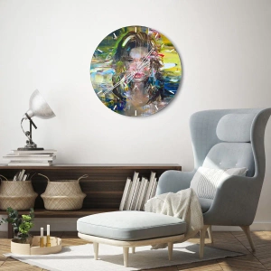El reloj de pared "Tras el velo de aire" es una auténtica obra de arte que combina funcionalidad con un diseño único. Su esfera presenta un retrato artístico de una mujer rodeada de colores dinámicos y abstractos que atraen la mirada y dotan al interior de un carácter único.
