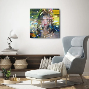 Reloj de pared - Reloj de vidrio - Retrato artístico de una mujer en abstracción colorida. - 30x30cm - Tras el velo del aire - Decoración de pared moderna para salón, cocina y dormitorio ARTTOR