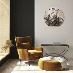 - Un reloj de pared con una pintura de niños en bicicleta sobre una pared de ladrillos. Un complemento perfecto para cualquier interior con carácter, creando un ambiente retro y único.