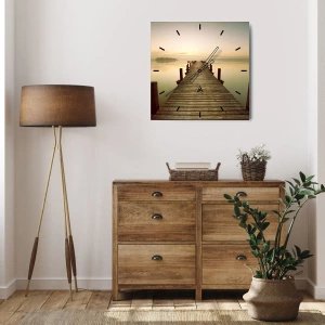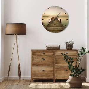 Reloj de pared - Reloj de vidrio - Un embarcadero de madera en un lago tranquilo por la mañana. - 30x30cm - Antes del amanecer, al amanecer, la luz - Decoración de pared moderna para salón y dormitorio ARTTOR