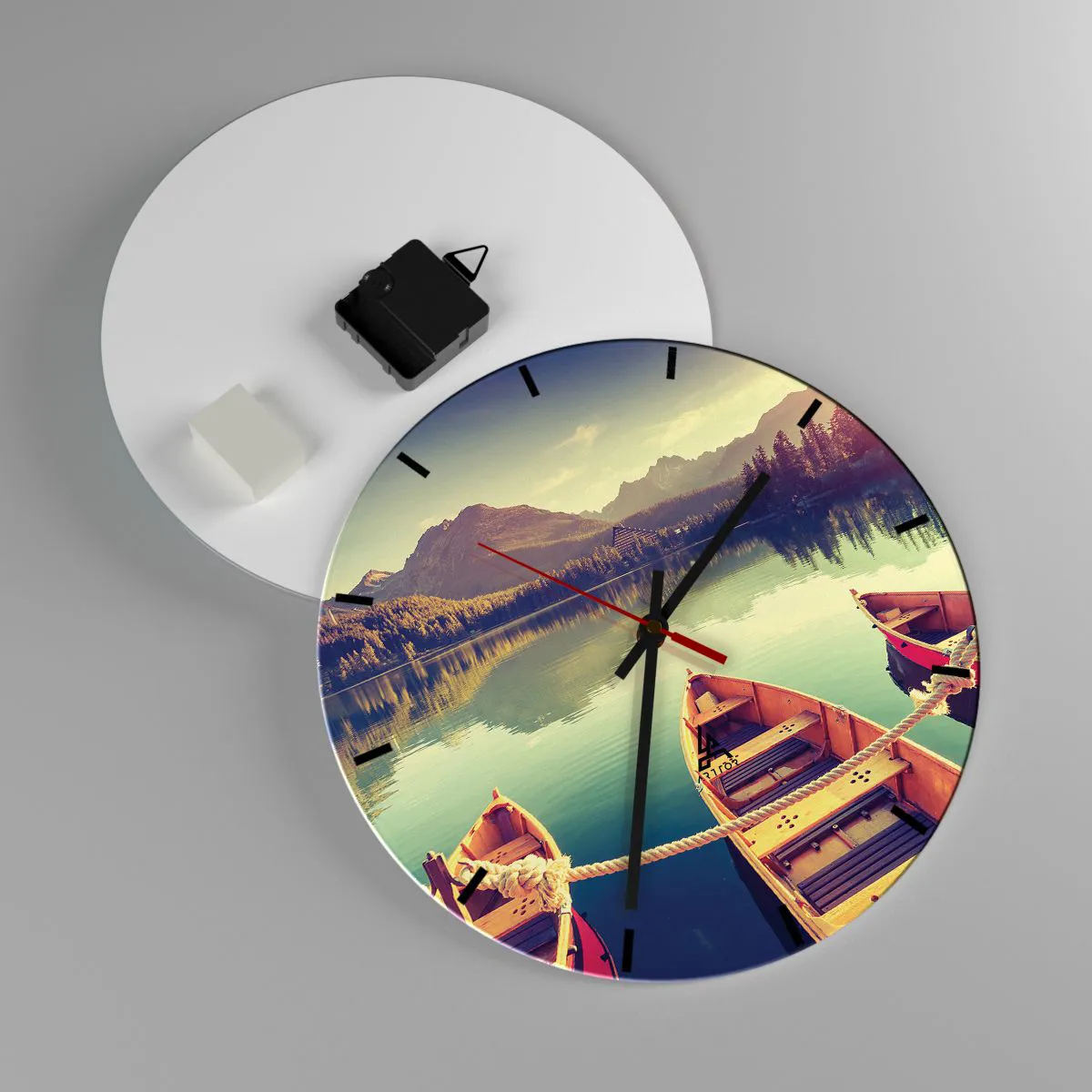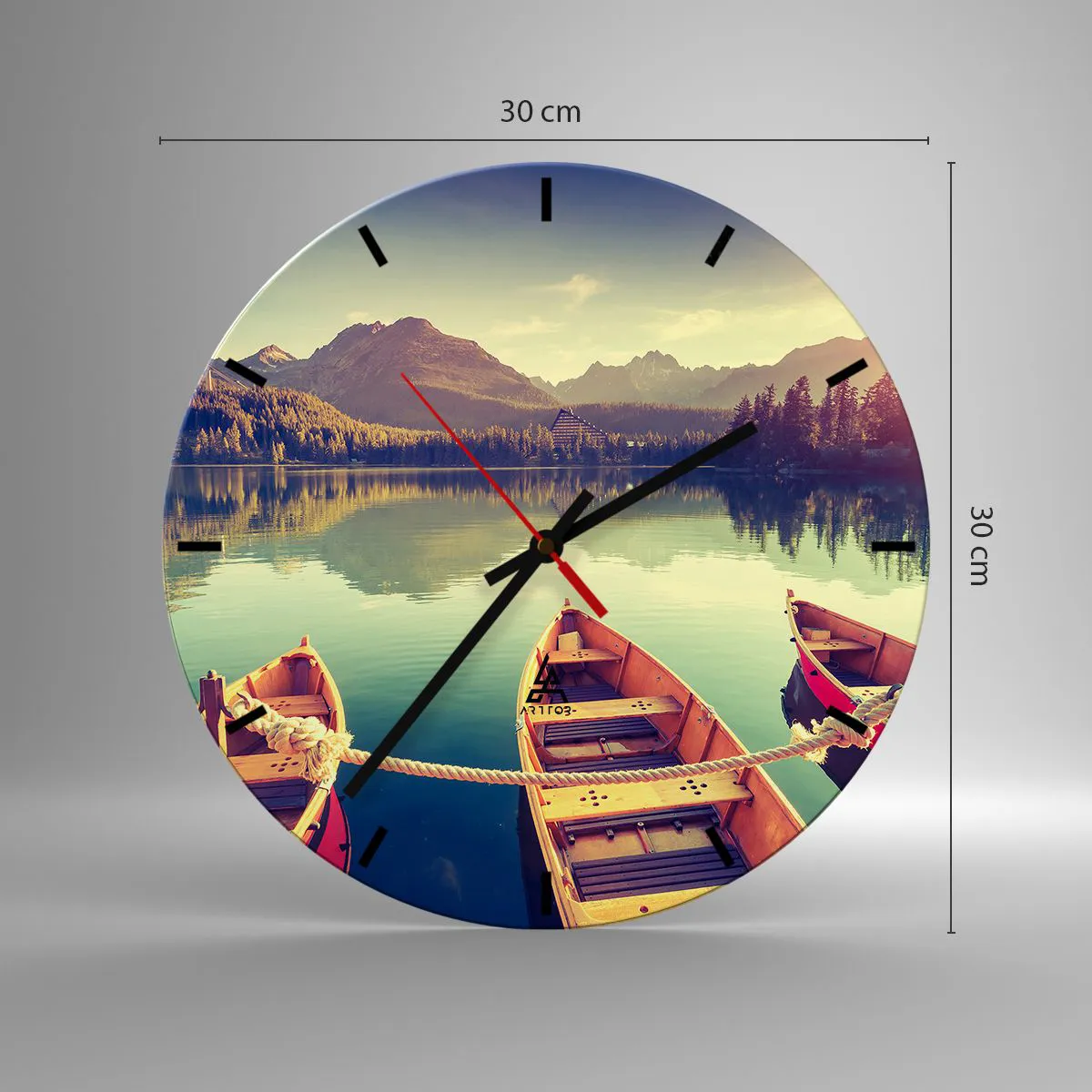 Reloj de pared - Reloj de vidrio - Barcos de madera amarrados en un lago tranquilo en las montañas. - 30x30cm - Para vivir según sus leyes - Decoración de pared moderna para salón, cocina y dormitorio ARTTOR