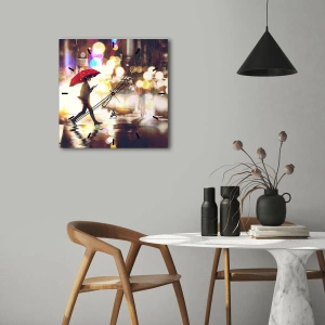 "And Yet Sunny" es un reloj de pared único que combina el encanto de una noche urbana con una sutil elegancia. El motivo representa una figura con un paraguas rojo, caminando bajo la lluvia, rodeada de reflejos de farolas. Esta composición atmosférica atrae la mirada y aporta un carácter único al interior.