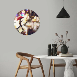 - Este reloj de pared redondo de 30 x 30 cm presenta una figura con un paraguas rojo sobre un fondo de luces nocturnas de la ciudad. Perfecto para interiores modernos y evocadores.