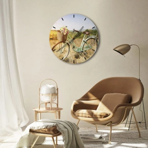 Me quedaré aquí un rato es un reloj de pared redondo de 30 x 30 cm fabricado en cristal de alta calidad. Representa una bicicleta con una cesta llena de flores de colores, con un pintoresco campo de fondo en un día soleado. Esta decoración crea un ambiente acogedor y armonioso en cualquier interior.