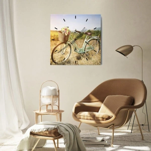 Reloj de pared - Reloj de vidrio - Una bicicleta con una cesta llena de flores en un campo en un día soleado. - 30x30cm - Me quedaré aquí un tiempo - Decoración de pared moderna para salón, cocina y dormitorio ARTTOR
