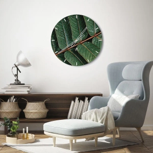 El reloj de pared "En un ritmo verde" es un accesorio único para los amantes de la naturaleza y los motivos botánicos. Fabricado en cristal redondo de 30 x 30 cm, representa un primer plano de hojas cubiertas de gotas de agua sobre un fondo oscuro. Es una elegante decoración que aporta armonía y frescura al interior.