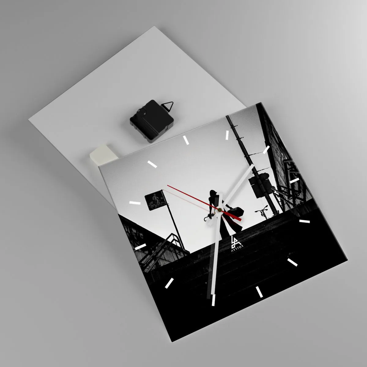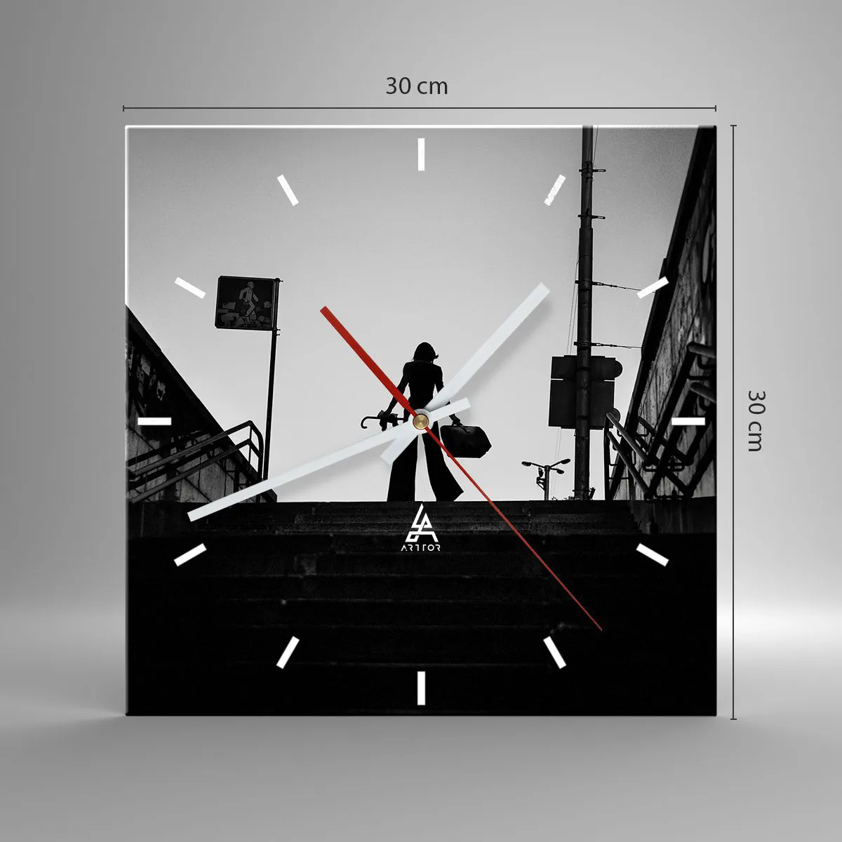 Reloj de pared - Reloj de vidrio - Una figura de mujer en las escaleras en blanco y negro con una atmósfera dinámica. - 30x30cm - Paseo urbano - Decoración de pared moderna para salón y dormitorio ARTTOR