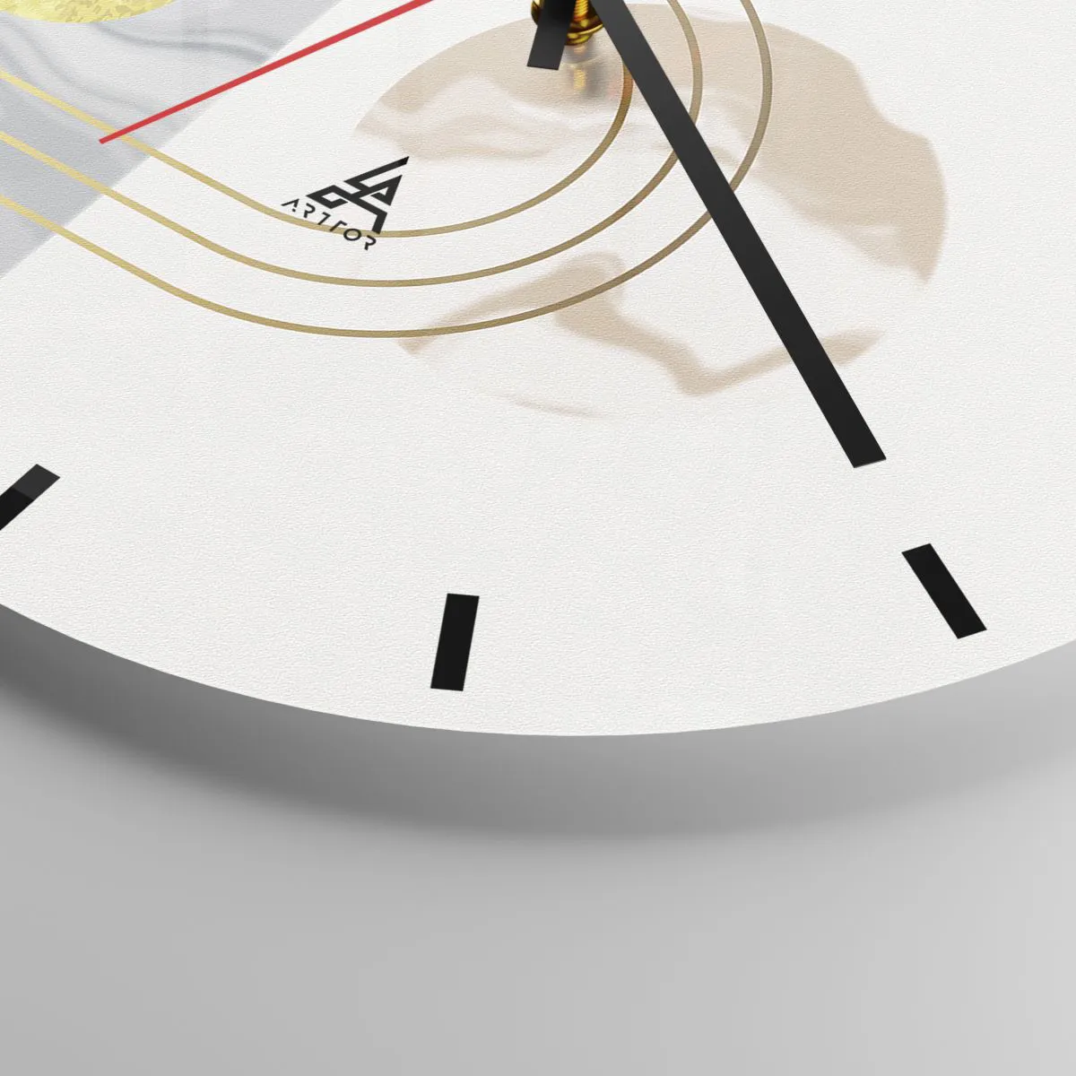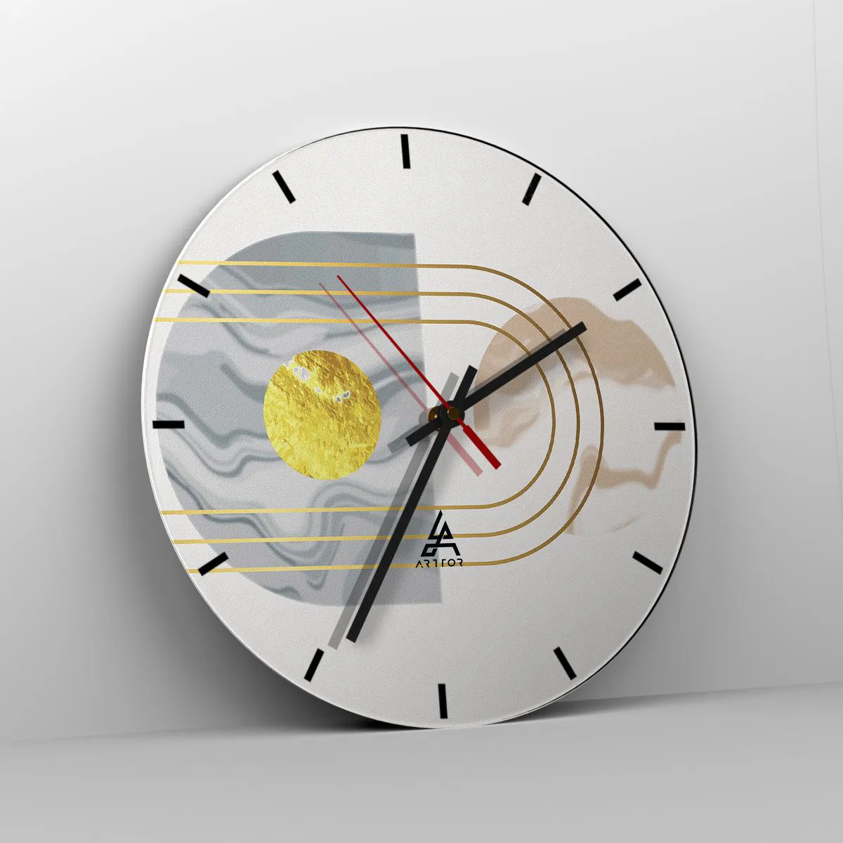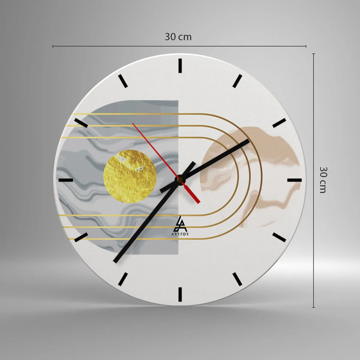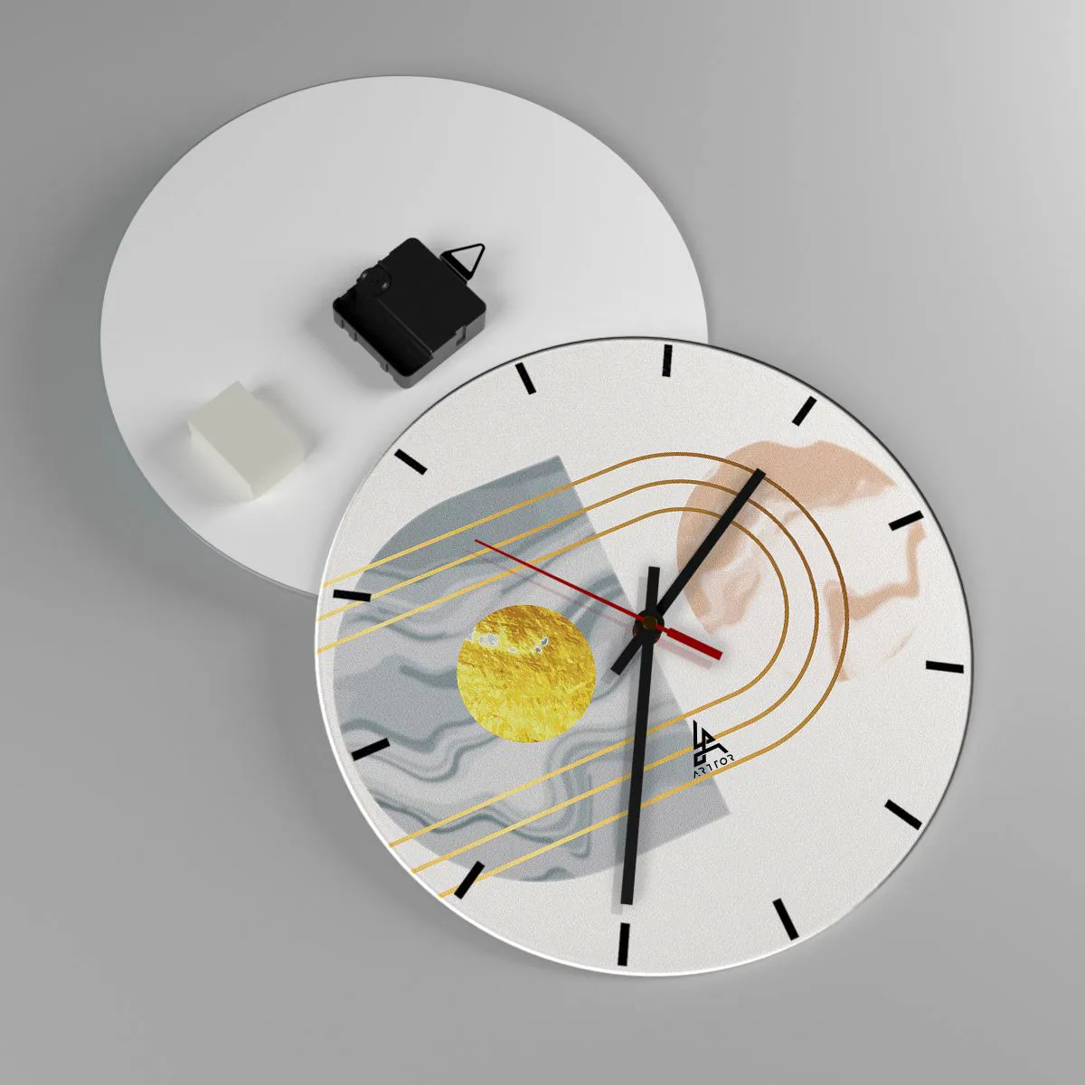 - Este reloj de pared redondo de 30 x 30 cm sobre cristal presenta una composición geométrica con un círculo dorado central y líneas dinámicas. Los colores brillantes y el elegante minimalismo complementan interiores modernos y artísticos.