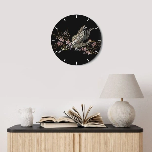Reloj de pared - Reloj de vidrio - Un pájaro en vuelo entre flores sobre un fondo negro. - 30x30cm - Ave florida - Decoración de pared moderna para salón, cocina y dormitorio ARTTOR