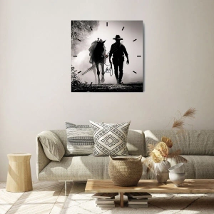 Reloj de pared "Mañana texana" es una pintura que evoca el espíritu del Viejo Oeste y la tradición del Oeste. En el centro de la composición, un vaquero camina con paso firme con un caballo a su lado, inmerso en la delicada niebla matutina. Las siluetas de las figuras resaltan gracias al contraste del blanco y negro, que realza su expresividad.