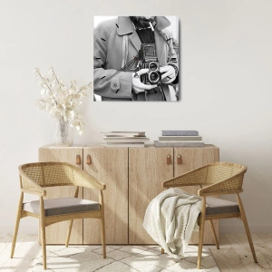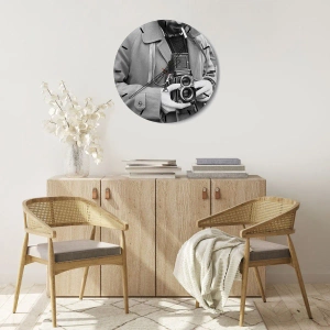 El reloj de pared "Estilo retro" expresa un enfoque artístico en la decoración de interiores, inspirado en el estilo retro y la pasión por la fotografía. Su esfera presenta una foto en blanco y negro de un hombre sosteniendo una cámara analógica clásica. El diseño general se mantiene en colores tenues y monocromáticos, que realzan a la perfección el carácter de la foto y le otorgan a la pieza un estilo atemporal.