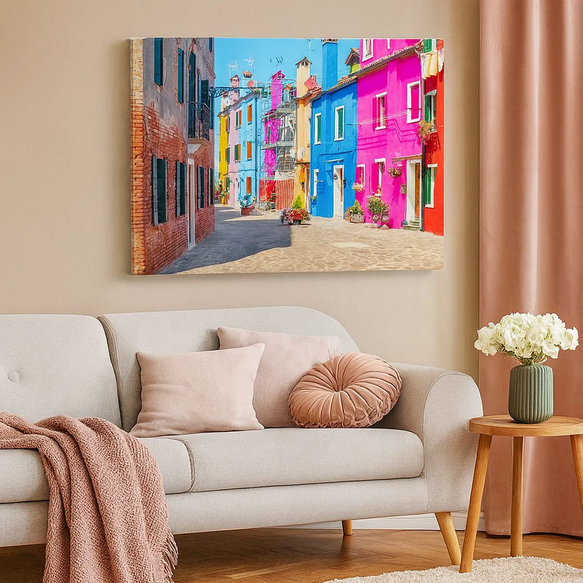 Cuadro sobre lienzo - Impresión de Imagen - Edificios coloridos en una calle estrecha de la ciudad - 100x70cm - Pueblo colorido - Decoración de pared moderna para salón y dormitorio ARTTOR